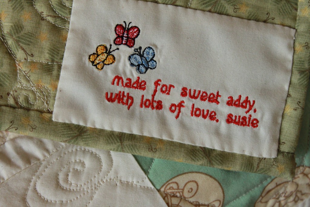 I’m finding out that I really need to label my quilts. I should have put the date on this but didn’t think about it at the time. This one should be easy to remember though, Addy’s first Birthday!