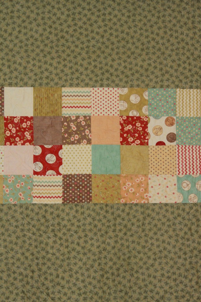 I made some modifications, as usual; I made it a little bigger and then added some charm blocks to the back. The top came together in an afternoon and I quilted it last week on the machine. I decided to try something a little different than my standard stippling and came across another blog via Pinterest, ‘The Free Motion Quilting Project’. I decided to give the ‘Lollipop Chain’ a try. They really didn’t look like lollipops, but more like lopsided spirals! It was fun and I am getting more and more comfortable with machine quilting.