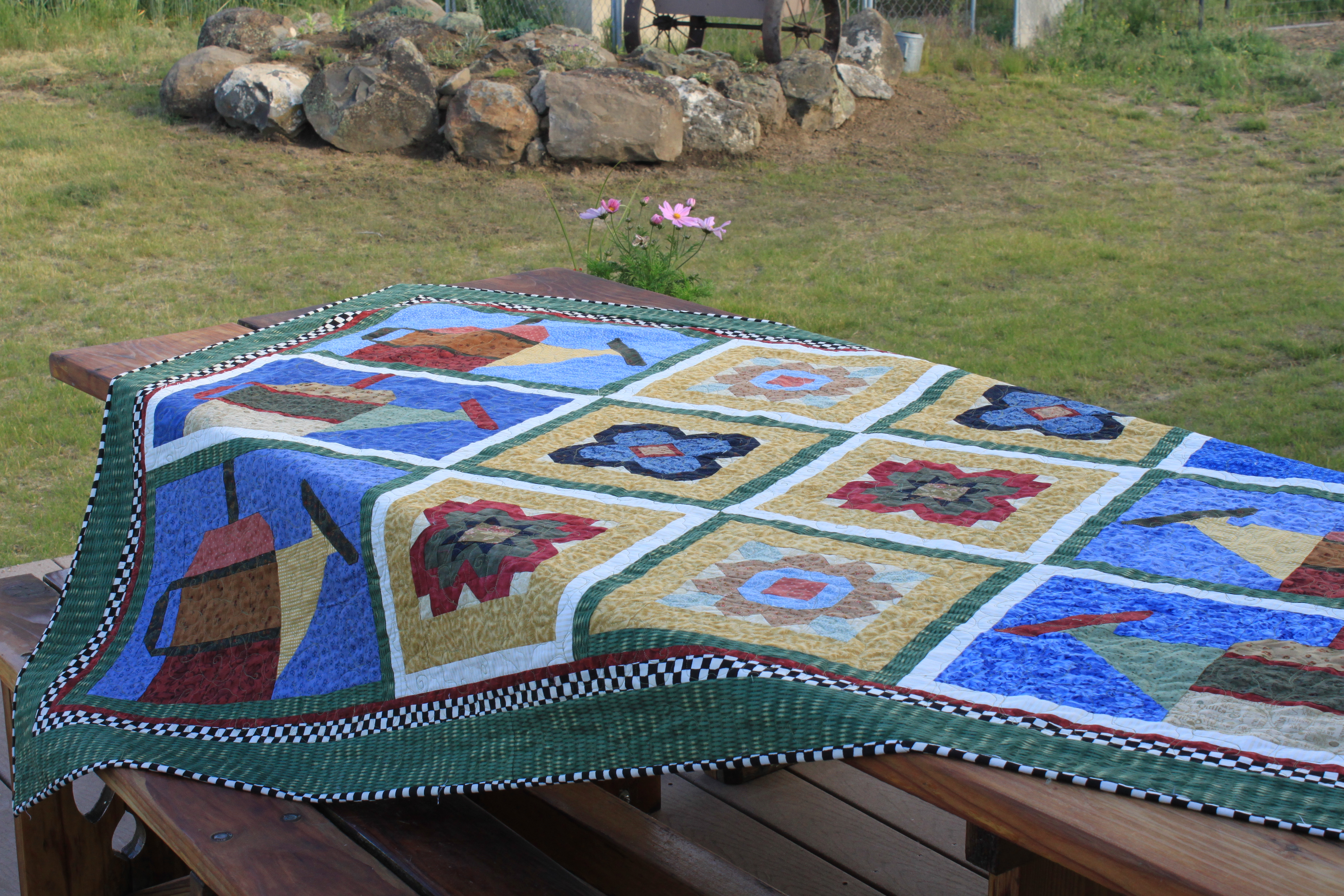 Now that ‘Harvest’ is over, I can catch up on a few loose ‘threads’ if you know what I mean. I did finish my watering can table cloth quilt that I blogged about in May. I machine quilted it and I must say that it was fun and the easiest one I have ever done. I think it was because I didn’t stress about it because it was just a table cloth! I was more relaxed and had fun making flowers and garlands of hearts. It turned out pretty cute and it was finished before our Greene reunion.