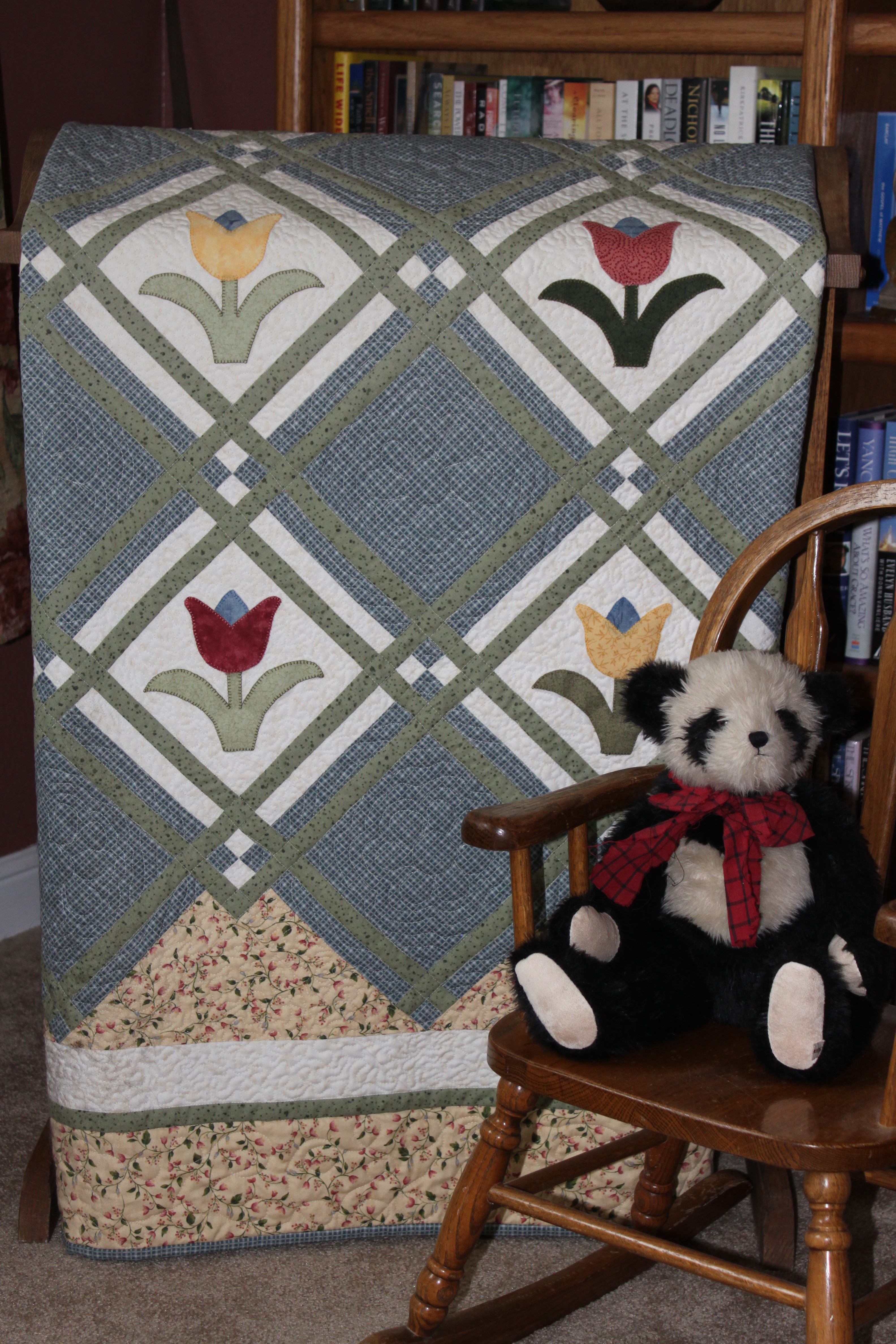 This quilt is appliqued with ‘steam a seam’ and then machine stitched with a blanket stitch. I machine quilted it on my bernina frame with my machine.